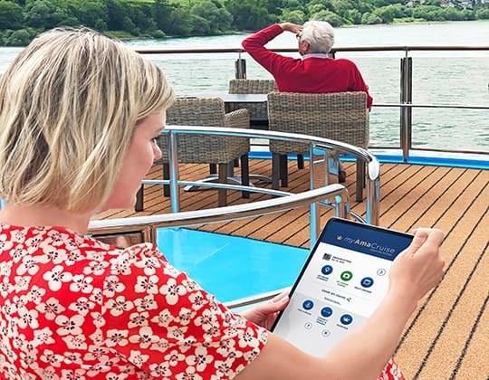 Stay in touch with our high-quality complimentary Wi-Fi, available on board throughout our fleet. In addition, our easy-to-use myAmaCruise app allows you view and share an interactive map that follows your river cruise itinerary, share photos with friends and family, learn about each port of call, find available excursions and even access your electronic travel documents.